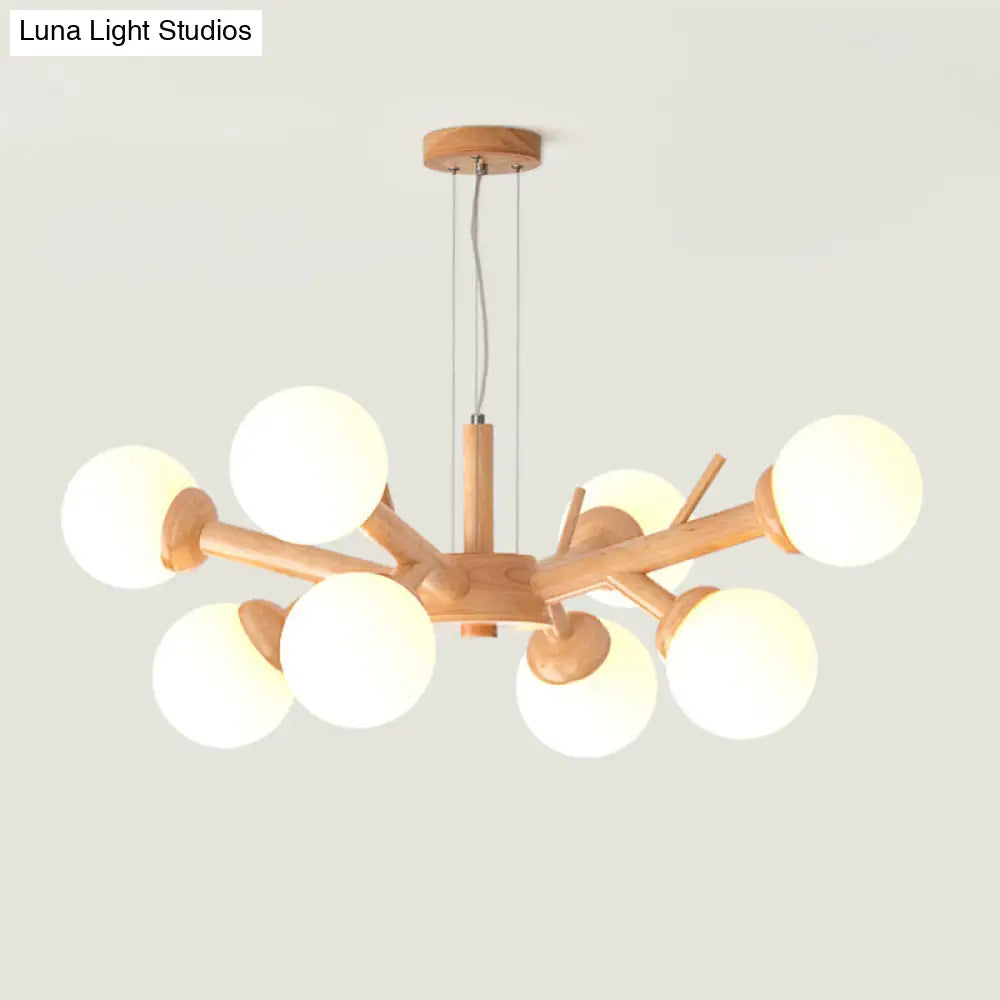 La lámpara de araña es de madera y tiene una pantalla esférica de cristal esmerilado. Se suspende del techo mediante una cadena y presenta un diseño sencillo y moderno. Está disponible en varios tamaños y con 6, 8, 10 o 12 luces. La pantalla es blanca y tiene un florón redondo. Utiliza bombillas E26/E27 y funciona con un voltaje de 110-120 V o 220-240 V. Es compatible con bombillas LED, incandescentes o fluorescentes.