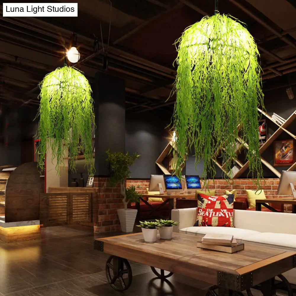 Industrial Green Metal Chandelier with Bell Cage Design and Wicker Ornament, 18"/21.5" Wide - Hanging Ceiling Light with 3 Heads