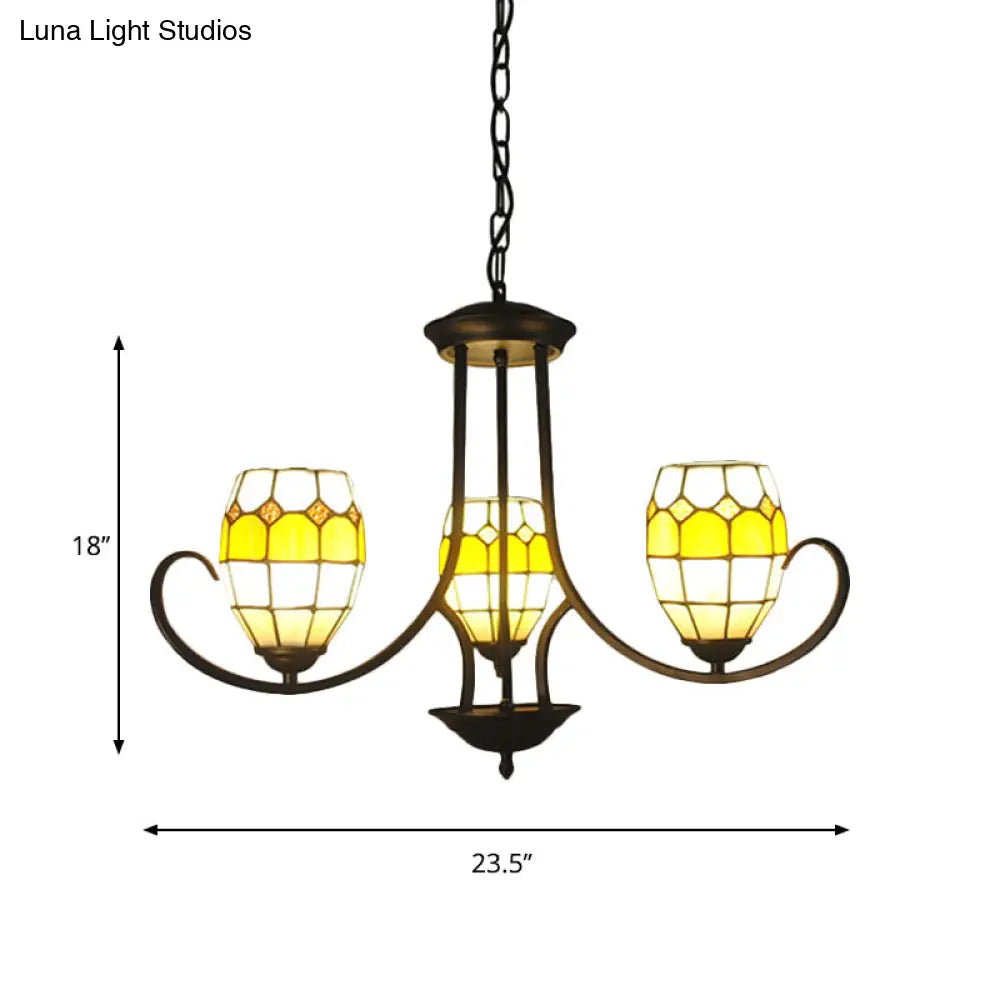 Yellow Stained Glass Tiffany Chandelier with 3 Oval Pendant Lights for Bedroom Lighting