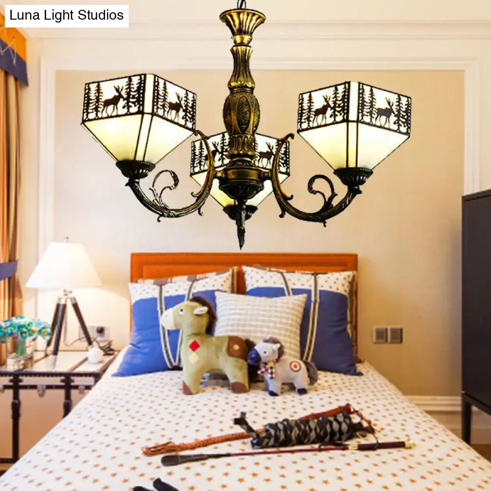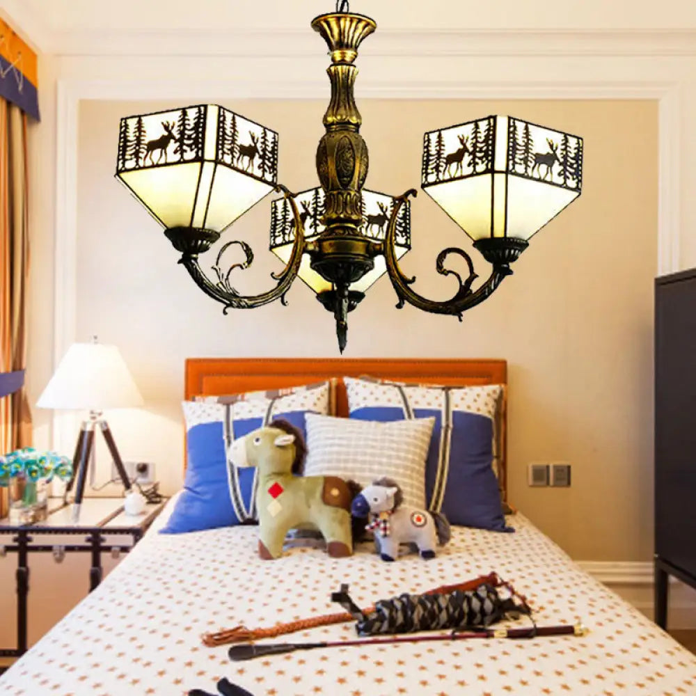 Small House Retro Stained Glass Chandelier with Deer and Tree in White - 3 Lights