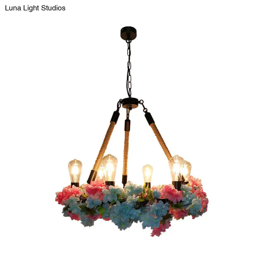 Industrial Metal LED Chandelier with 6 Bulbs, Black Finish and Cherry Blossom Detail