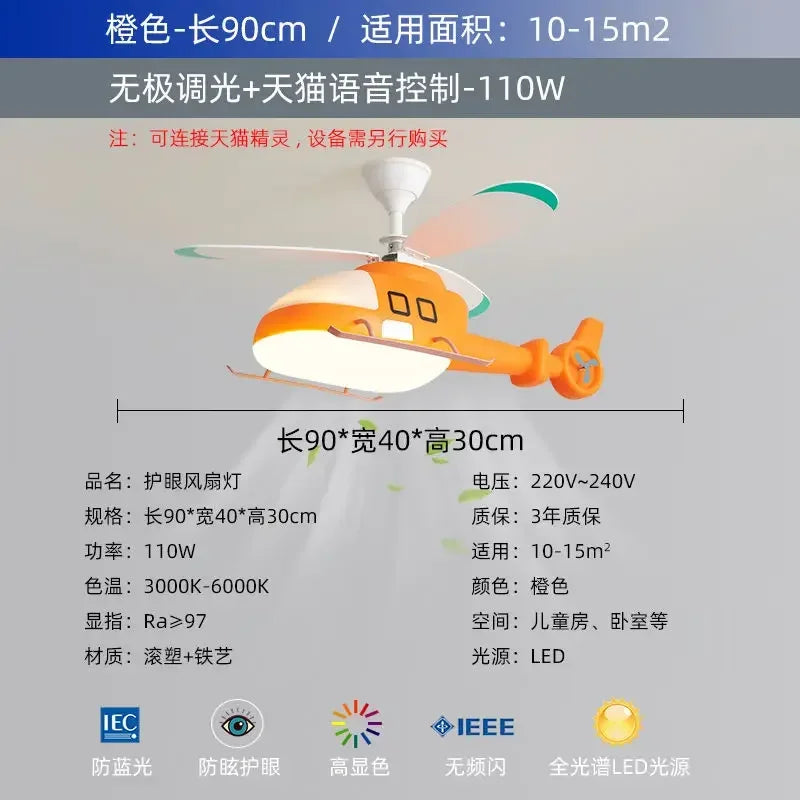 Introducing the Helicopter Aircraft Ceiling Fan Children's Chandelier, designed to bring a touch of whimsy and charm to your child's room. This unique chandelier is perfect for a kid's room, adding a playful element to the decor.