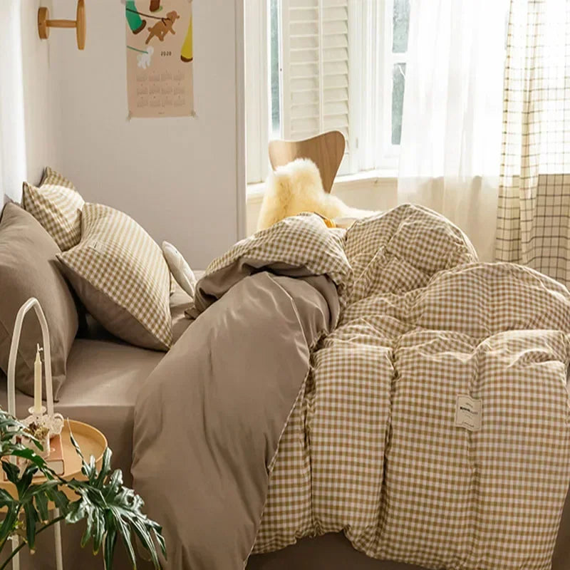 Elevate your bedroom decor with the Japanese Grid Print Bedding Set, crafted for all seasons. This exquisite quilt cover is designed to fit Queen or King size beds, offering a perfect blend of style and comfort.