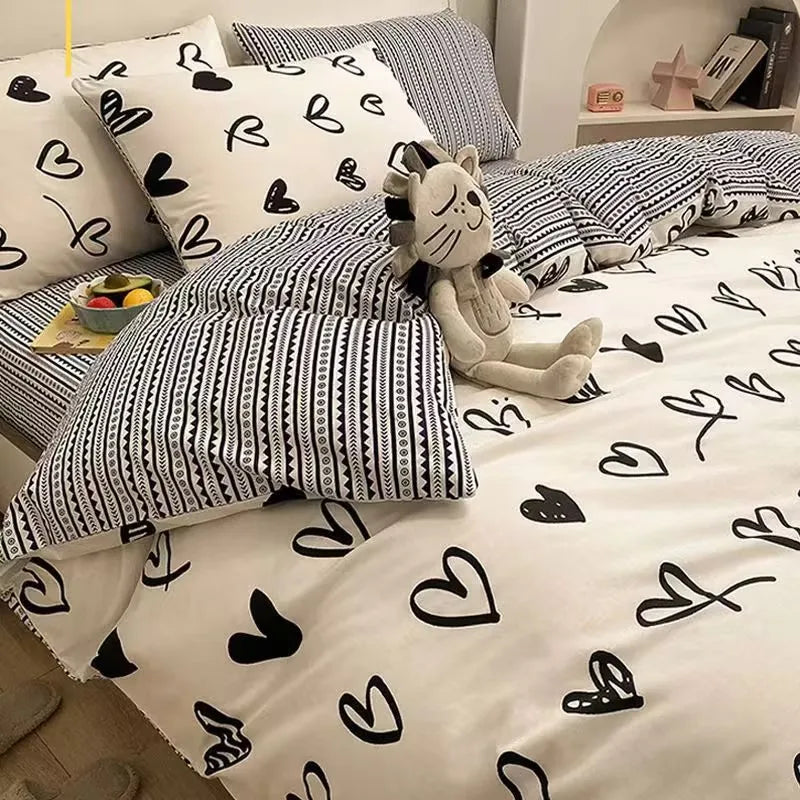 Our Checkerboard Pattern Duvet Cover Set includes 4 pieces: a duvet cover, 2 pillowcases, and 1 sheet. The material is predominantly cotton, ensuring a soft and breathable feel that enhances your overall comfort while you sleep.