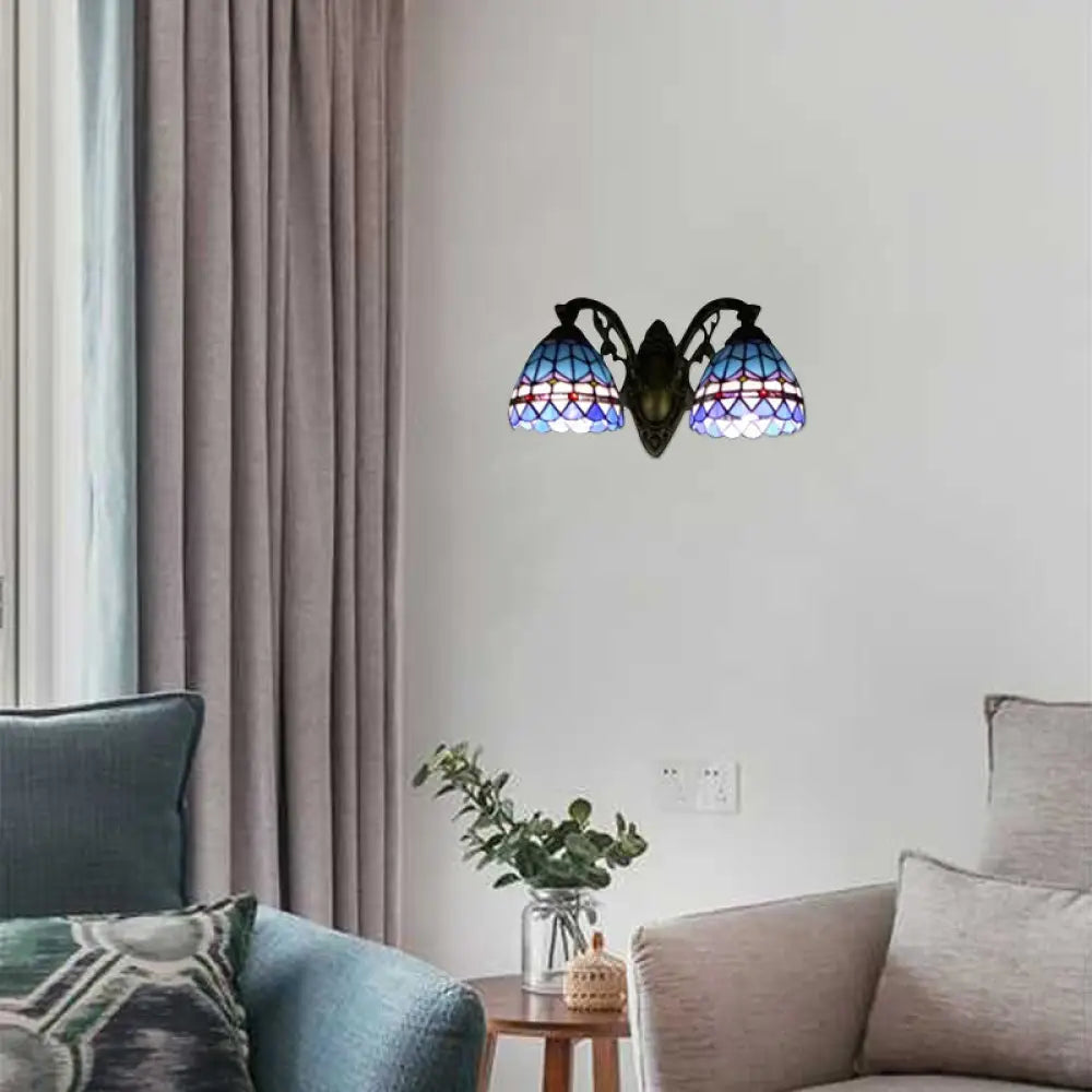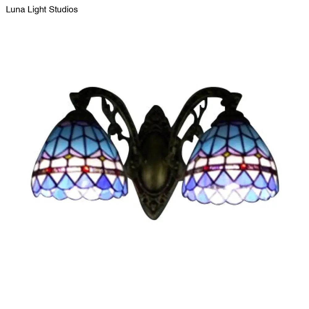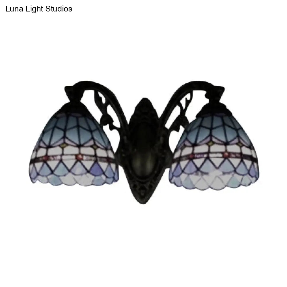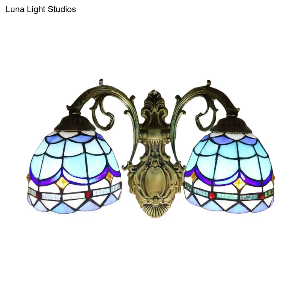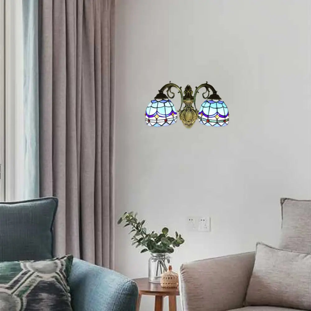 Blue Baroque Stained Glass Dome Sconce Light with Curved Arm - 2 Light Wall Fixture for Bedroom