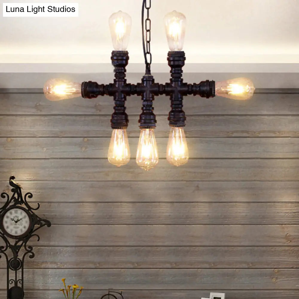 Industrial-Style Black Chandelier: 7-Head Wrought Iron Plumbing Pipe Pendant Light