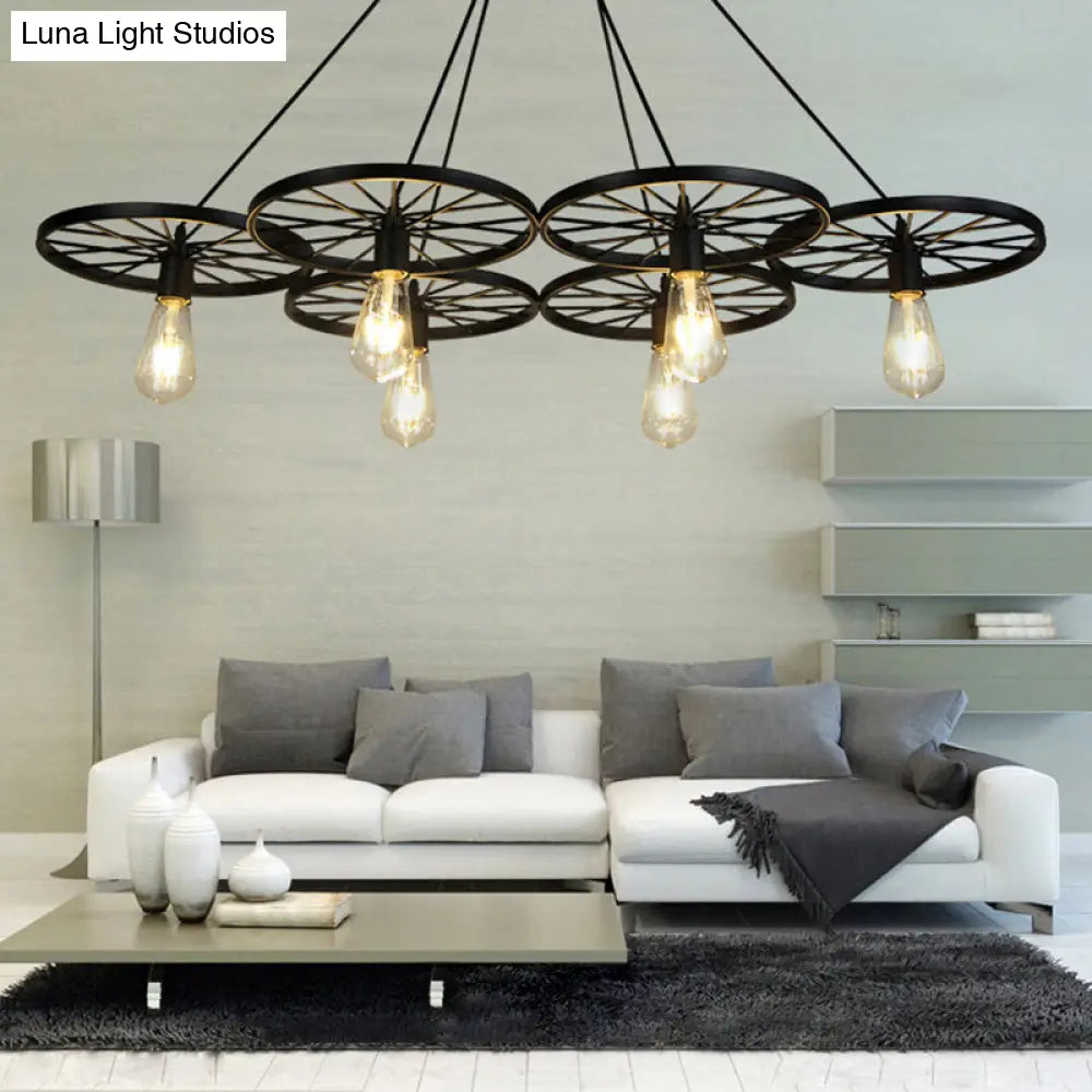 Black Industrial Wheel Chandelier for Living Room: Metal Hanging Light Fixture