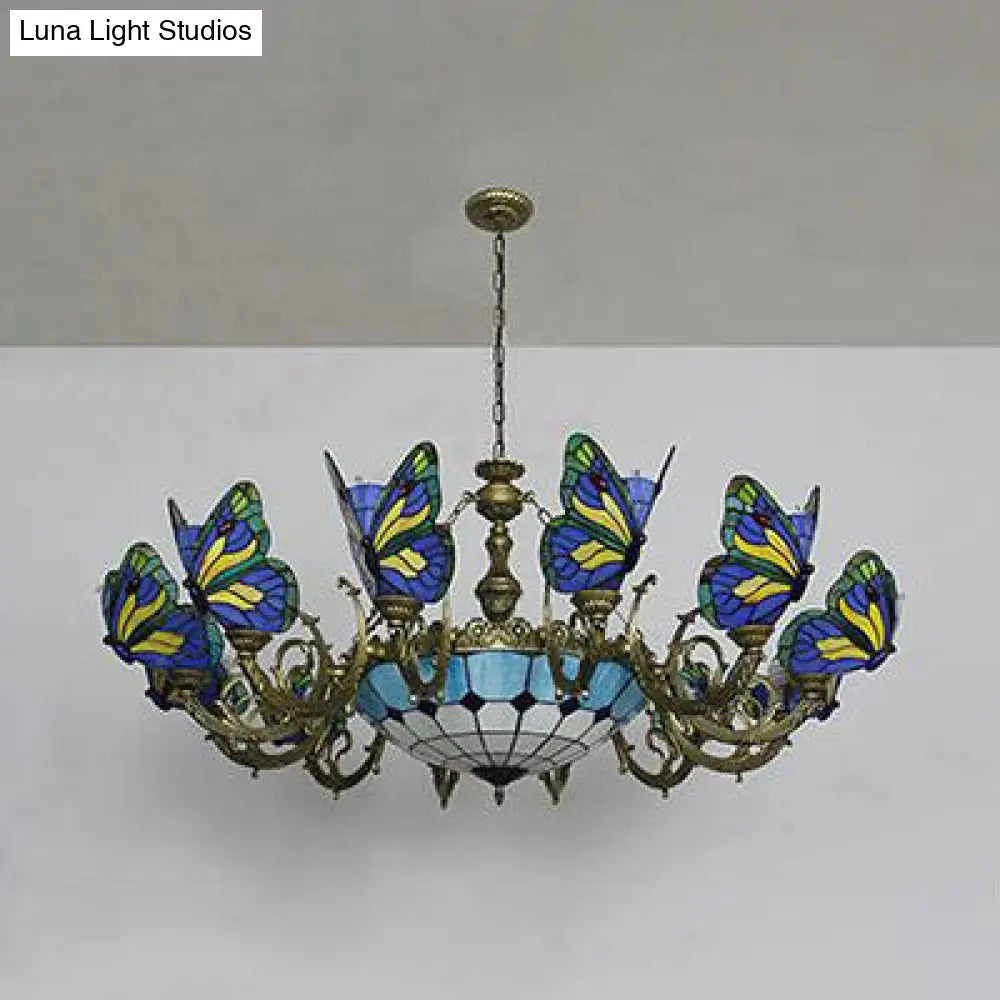 Stained Glass Tiffany Chandelier - Butterfly Indoor Pendant Light in Blue Tones for Hallway