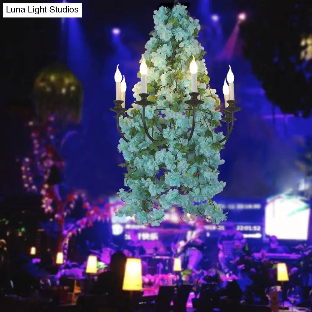 Blue LED Candle Restaurant Chandelier with Industrial Metal Frame - 8 Bulbs, Flower Decor - Pendant Lighting for Ceiling