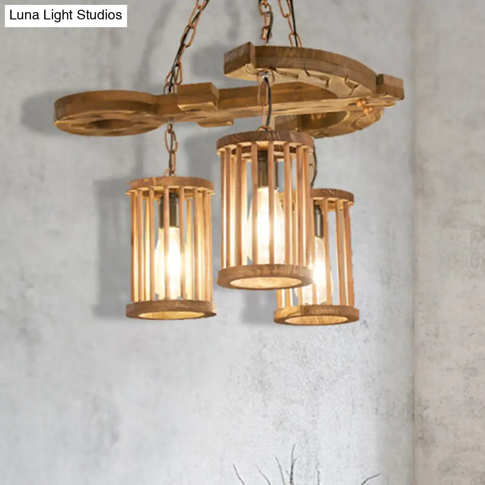 Industrial 3-Light Wood Chandelier Pendant with Cylinder Shade and Chain - Perfect for Dining Rooms