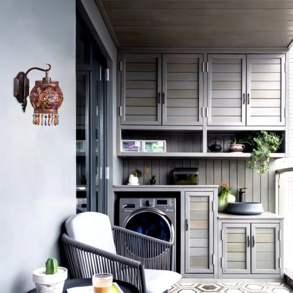 DecorBites™ Bohemia Lantern Wall Sconce Metal 1-Light Lamp with Crystal Flower Design, Antique Copper