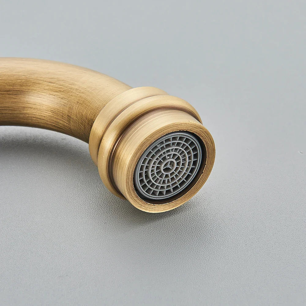 Crafted with the finest materials, this deck-mounted faucet exudes elegance with its antique brass finish. The single-handle design allows for easy temperature and flow control, while the ceramic plate spool ensures smooth operation for years to come.