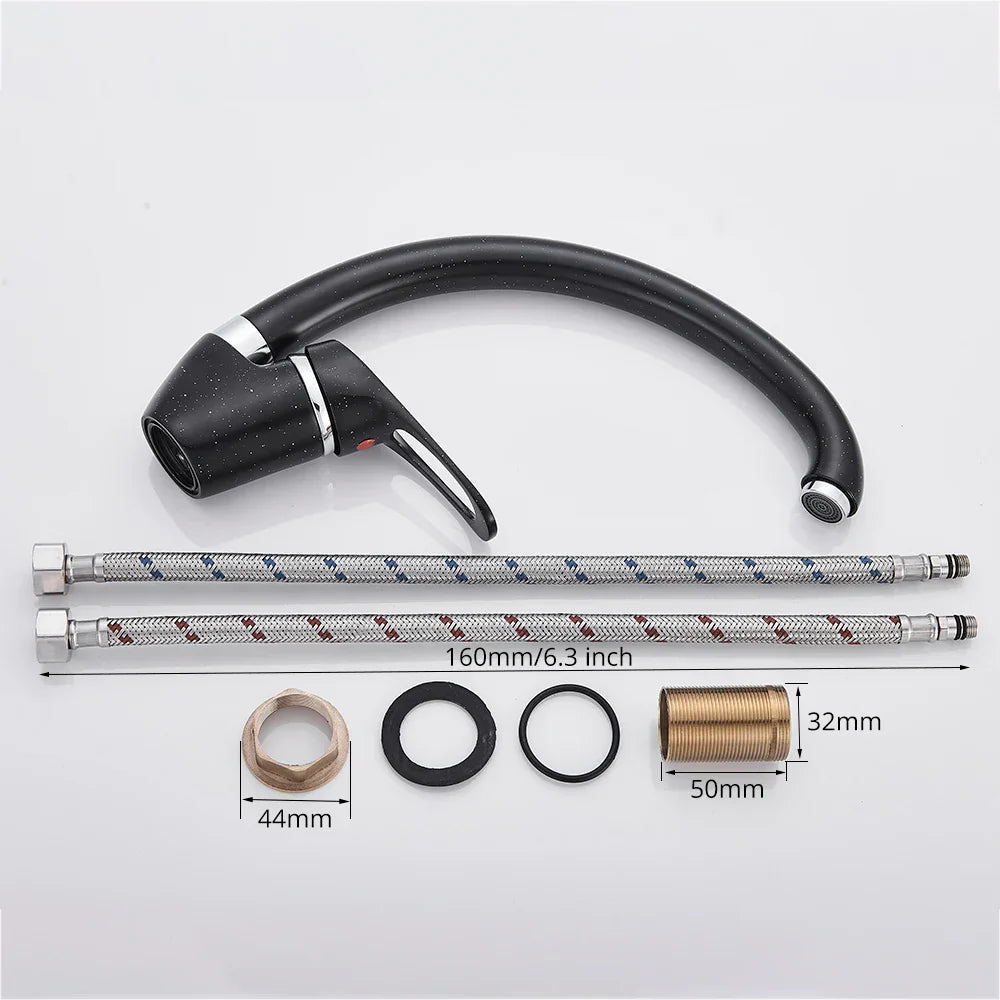Included in the package are the faucet, hot and cold water pipes, and installation accessories, making it easy to set up and start using right away. Plus, with a 5-year warranty, you can trust that your Decorbites Brass Black Kitchen Sink Faucet will stand the test of time.