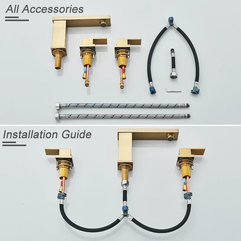 Introducing the Decorbites Brushed Gold Black Dual Handle Waterfall Bathroom Sink Faucet, a true masterpiece in design and functionality. This exquisitely crafted faucet is a perfect blend of style and sophistication, adding a touch of elegance to any bathroom decor.