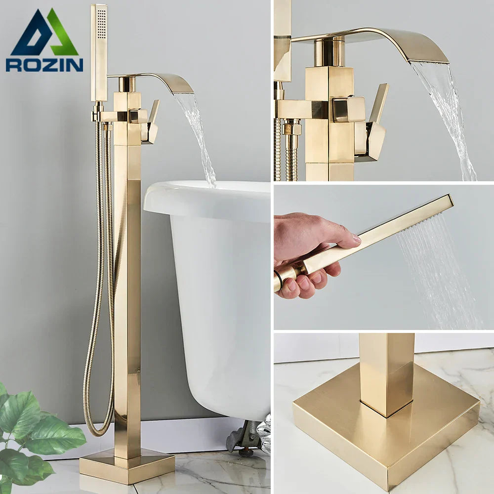 DecorBites™ Brushed Gold Tub Shower Faucet Floor Mounted Waterfall Mixer Tap