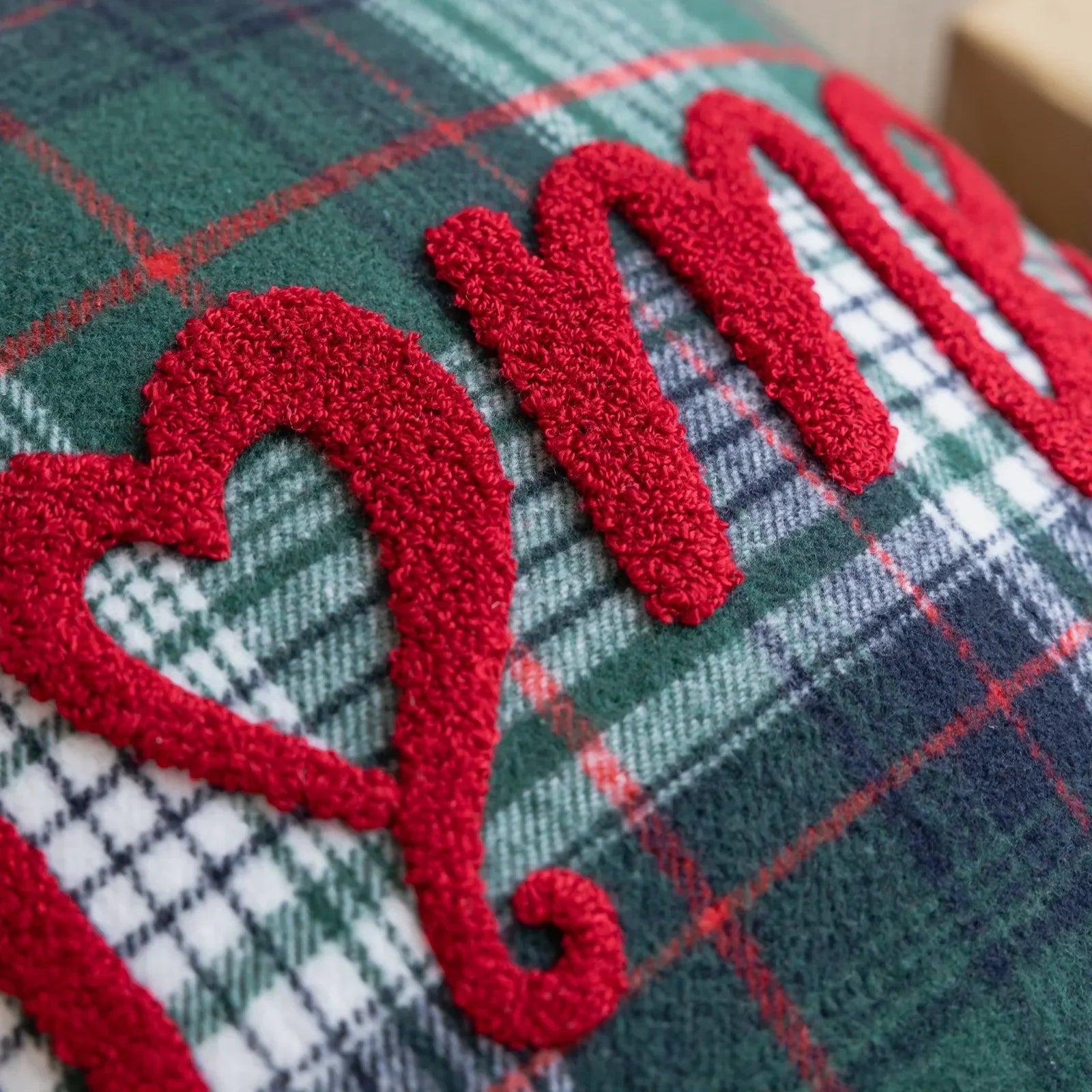 Crafted from a blend of polyester and cotton, this square pillow case features a classic plaid pattern in retro red and green colors. The embroidered Home Snowflake Jingle Bell pattern adds a touch of winter magic, perfect for the holiday season.