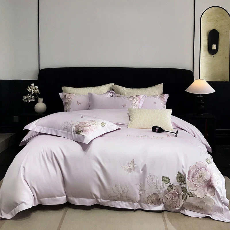 DecorBites™ Butterfly Flowers Embroidery 600TC Egyptian Cotton Bedding Set: Duvet Cover, Bed Sheet, Pillowcases