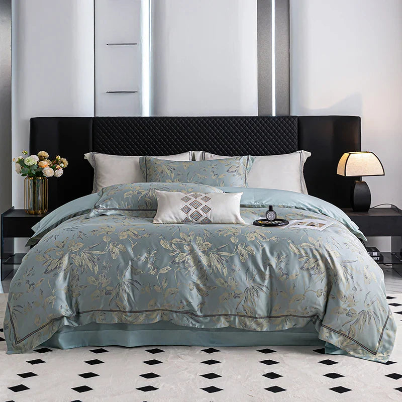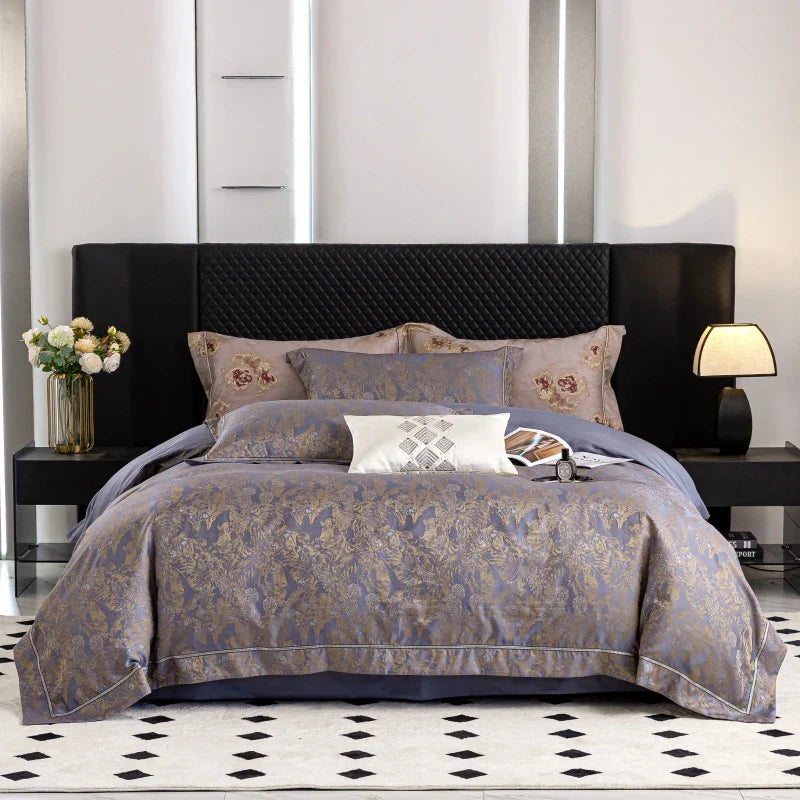 The material used is a combination of Lyocell Cotton, known for its durability and breathability, perfect for a restful night's sleep. The jacquard fabric style adds a touch of glamour, making it suitable for the Northern European aesthetic.