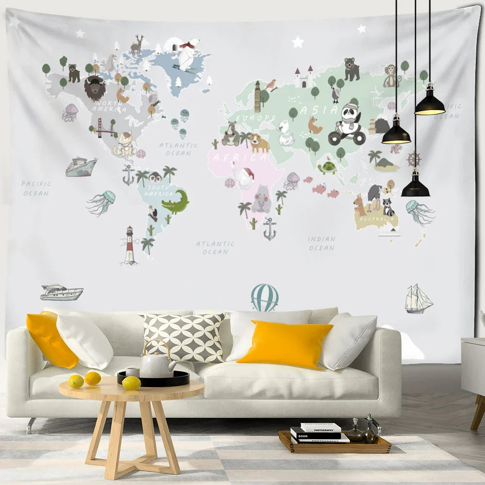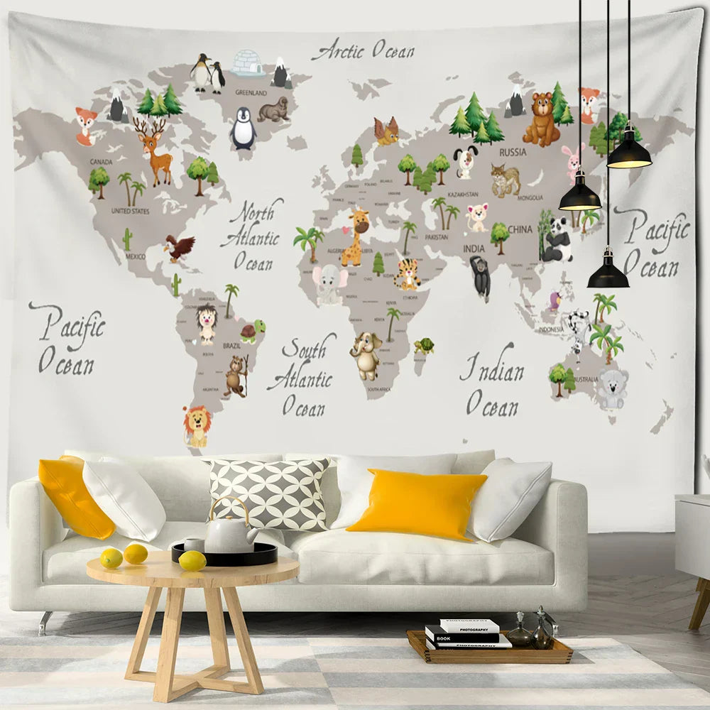 DecorBites™ Cartoon Animals Map Tapestry Wall Hanging for Cute Children's Room Decor