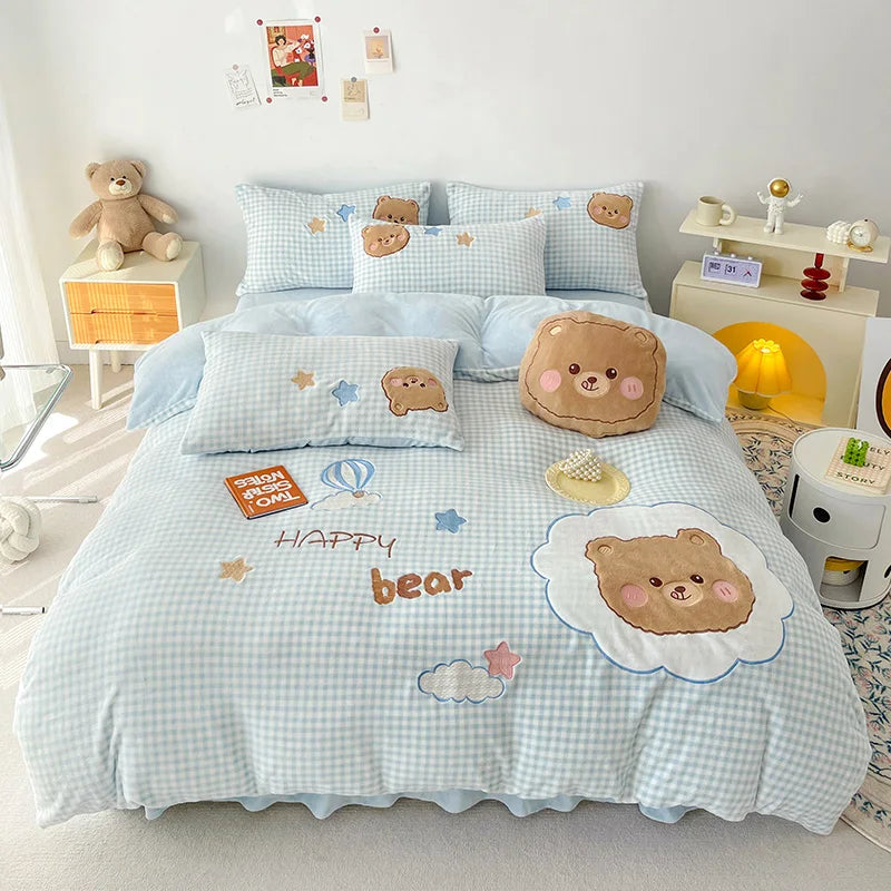 DecorBites™ Cartoon Rabbit Applique Embroidery Bedding Set with Velvet Fleece for Cozy Comfort