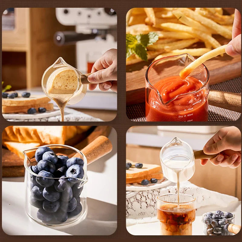 DecorBites™ Glass Espresso Measuring Cup with Wood Handle, Transparent Milk Jug