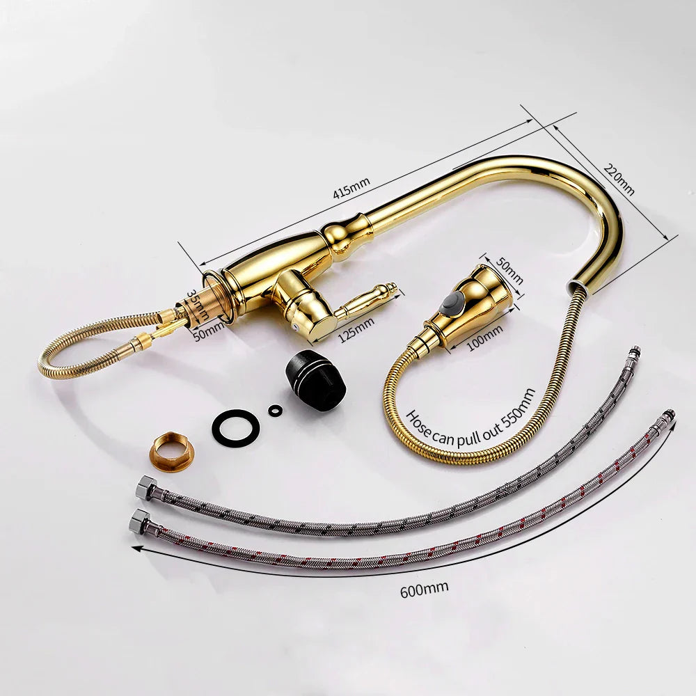 The Gold Kitchen Sink Mixer Faucet is perfect for any modern kitchen with its contemporary style and sleek lines. The pull-out spray head adds versatility, making it easy to tackle various kitchen tasks with precision. With its single hole installation and vertical mounting, this faucet is not only stylish but also practical for everyday use.