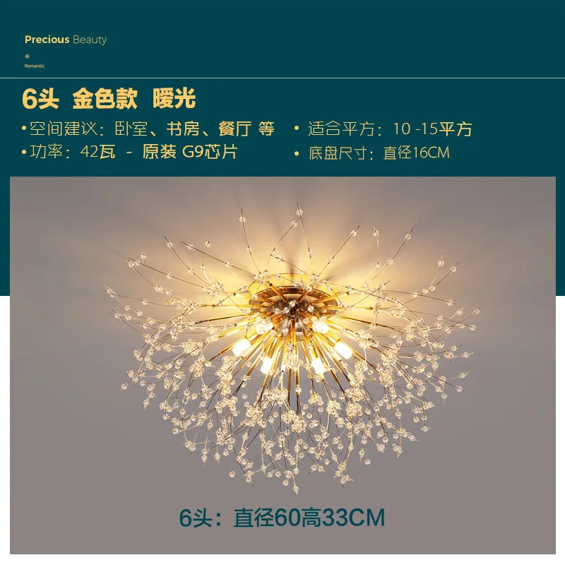 Introducing the Golden Dandelion Crystal Chandelier, a stunning piece that adds a touch of romance to any living room. This Warm Nordic LED Ceiling Lamp is designed to create a cozy and intimate atmosphere, perfect for relaxing or entertaining guests.