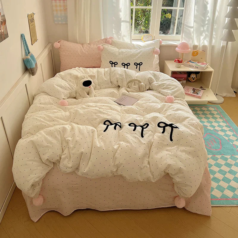 Introducing the Korean Princess Bow Lattice Pompom Bedding Set – fit for royalty and designed to bring a touch of elegance to your bedroom.
