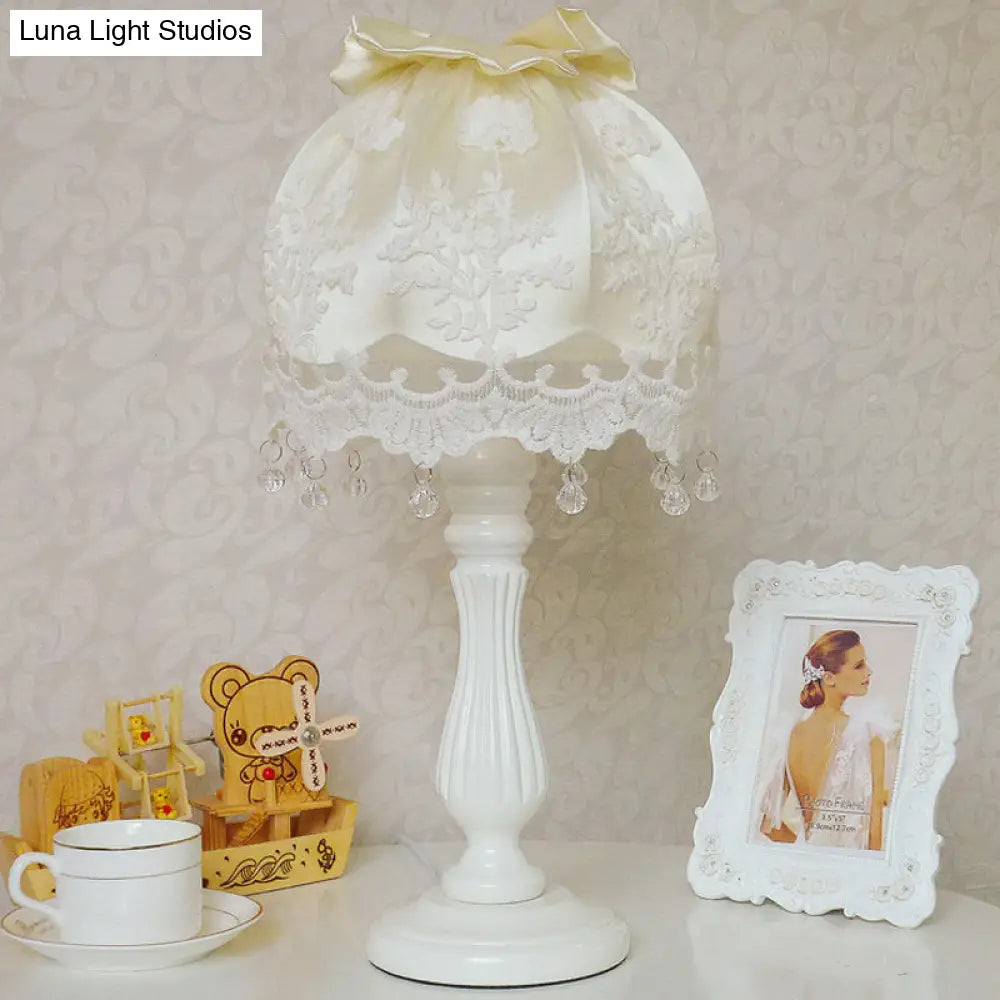 Contemporary Dome Nightstand Lamp - Cream Fabric Shade, Wood Base - Table Light with Drape