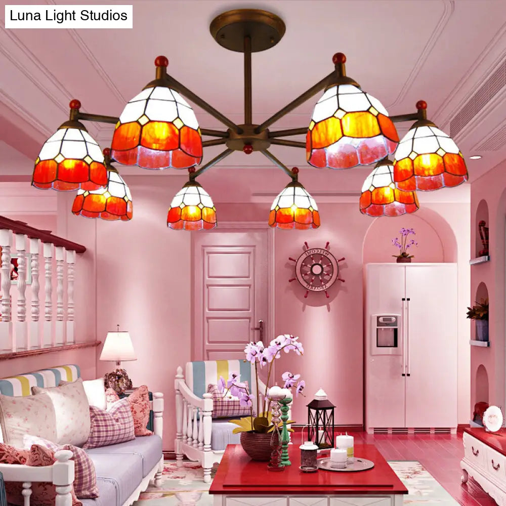 Rustic Stained Glass Dome Hanging Pendant Chandelier Light - 8 Lights - Red/Blue/Yellow – Bedroom Lighting