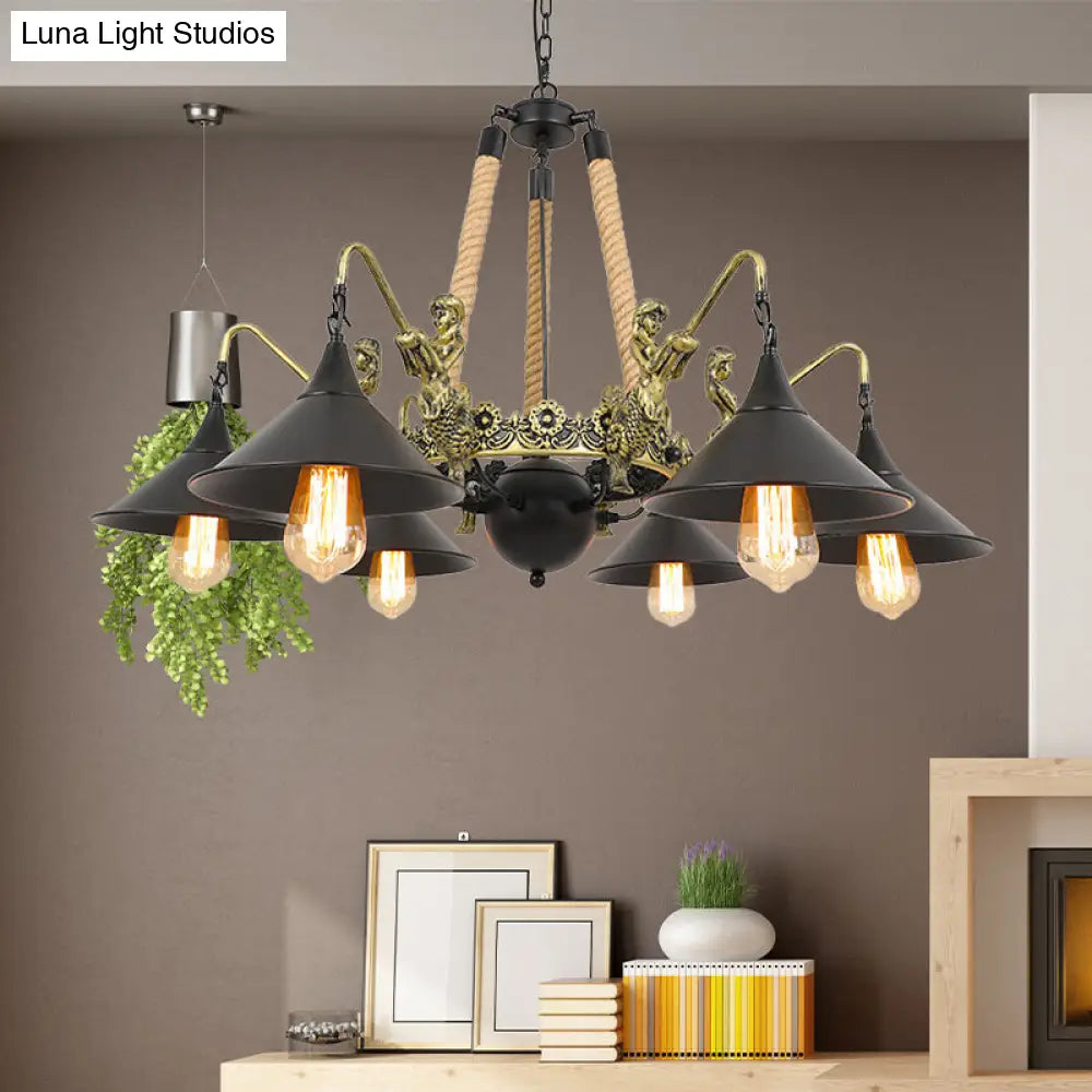 Black Industrial Bell Chandelier Light w/ Mermaid Deco - Metal/Rope Suspension | 6/8 Bulbs