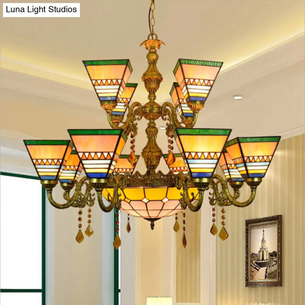 Industrial Vintage Stained Glass Pyramid Chandelier - 12 Arms with Center Bowl