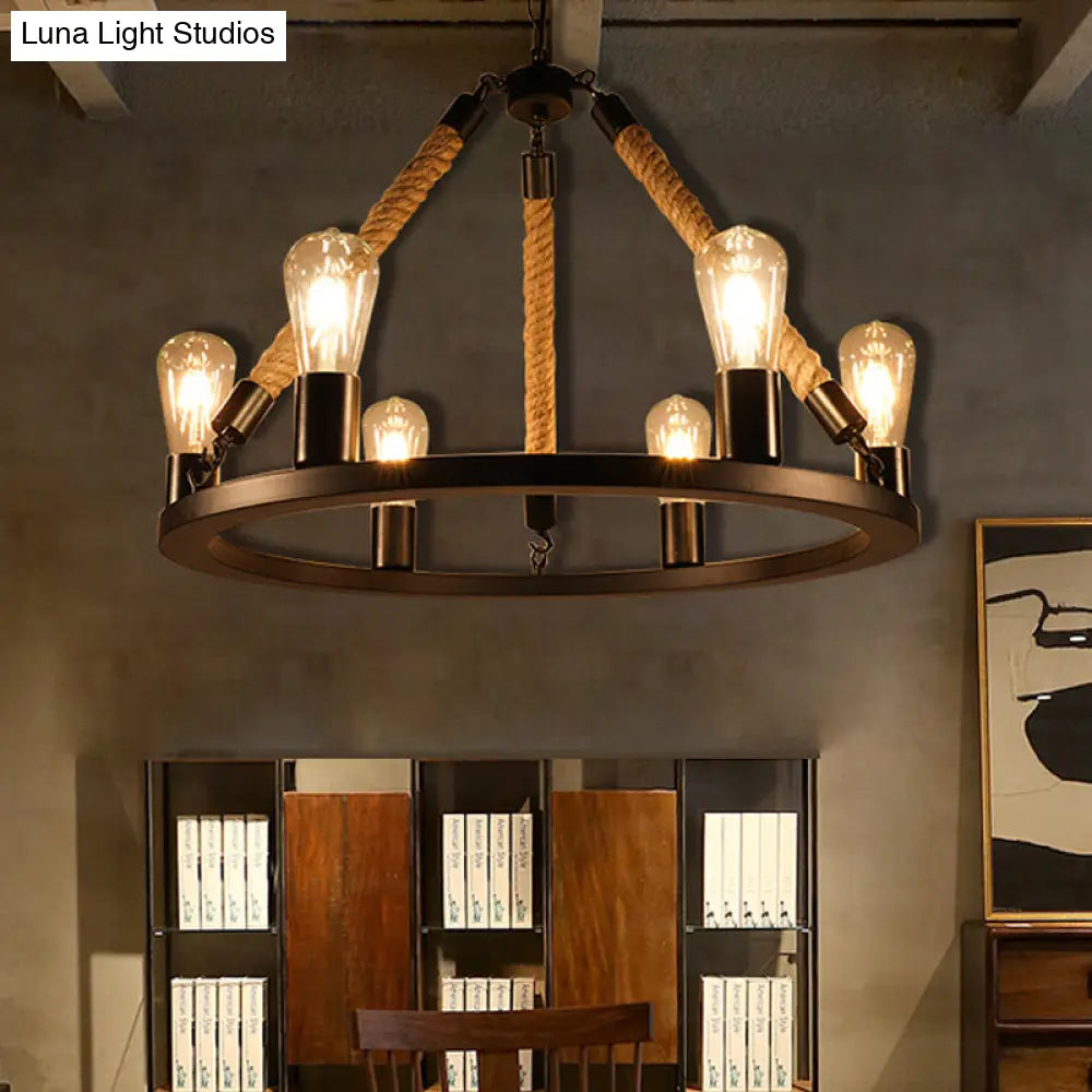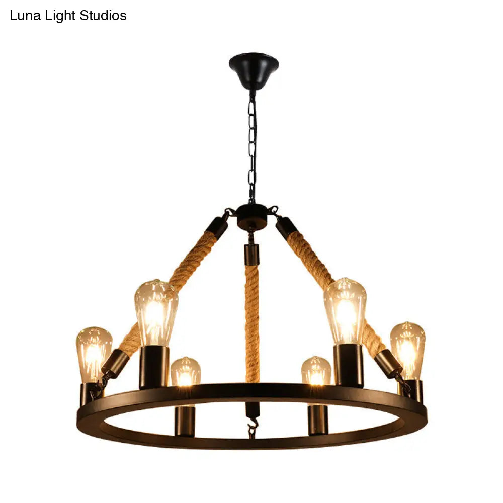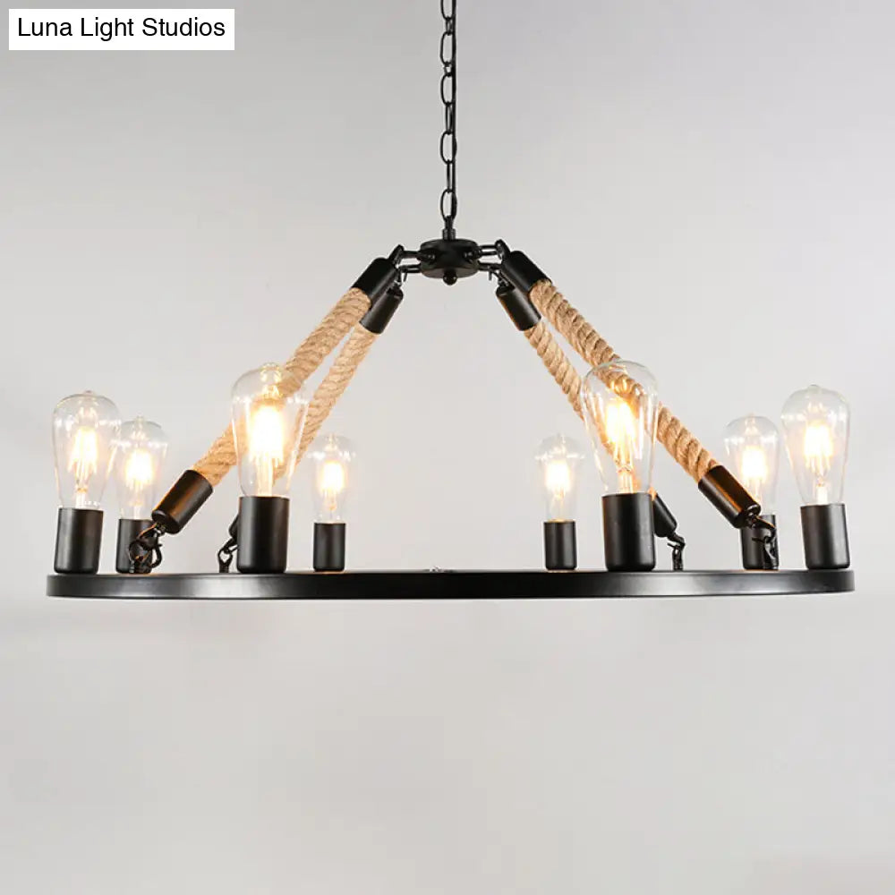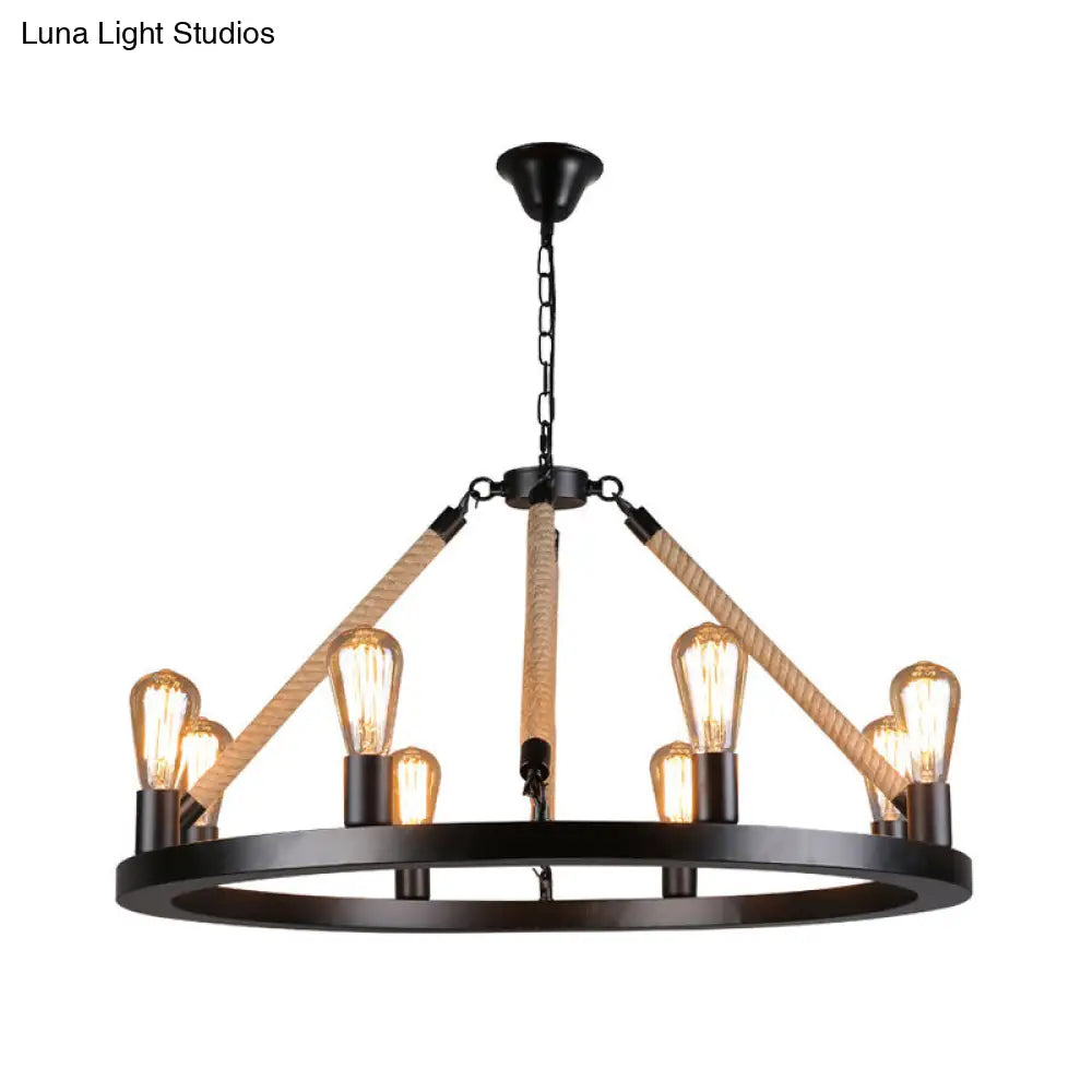 Industrial Metal Chandelier: Open Bulb 6/8-Light Rope Pendant Lamp, Black with Ring Design - Dining Room Lighting Fixture