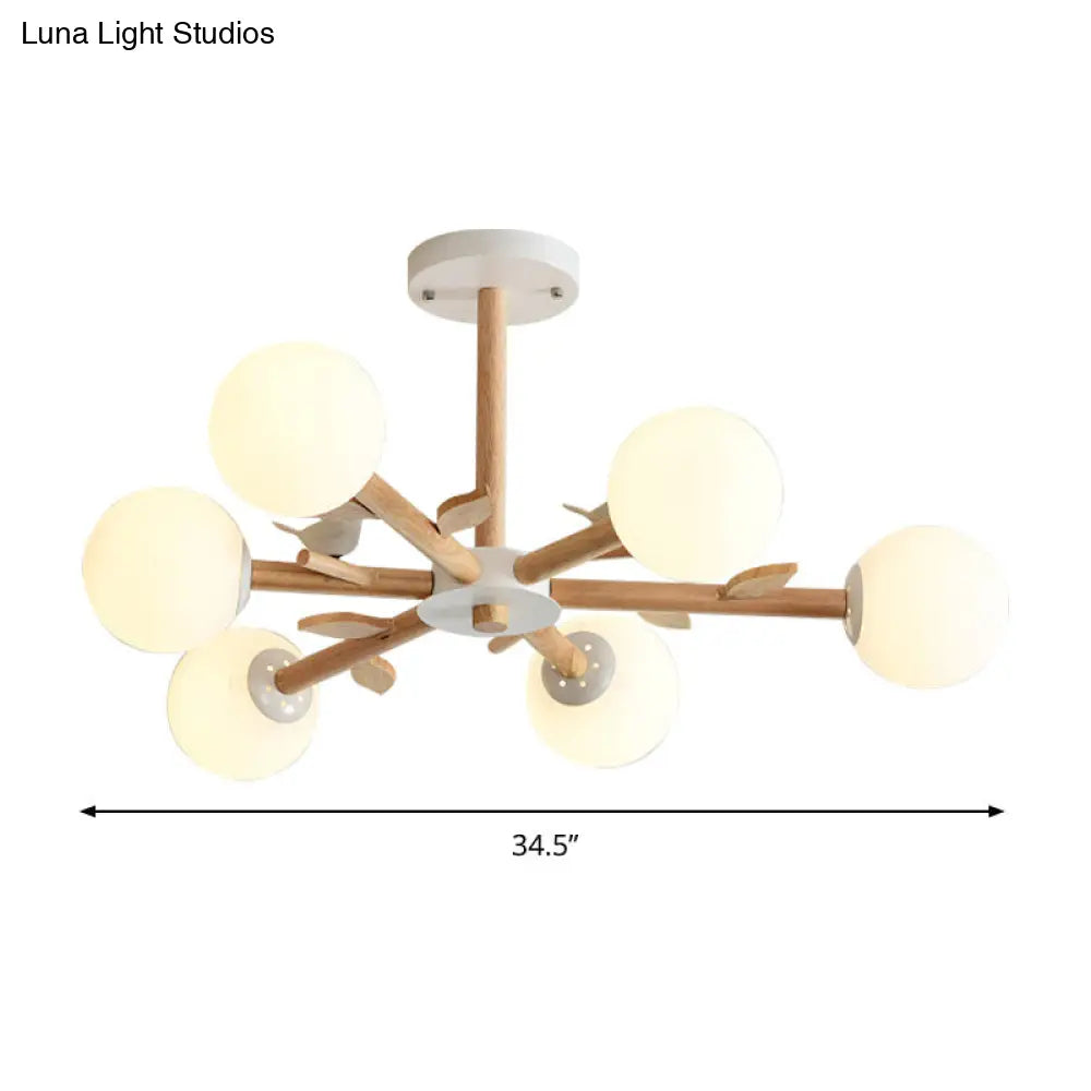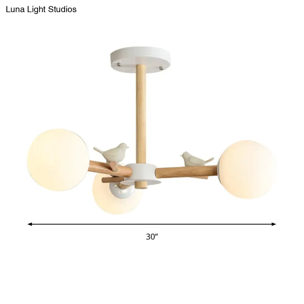 Japanese-Inspired Bedroom Chandelier with Orb Shade, Birds, Wood, and Glass in White