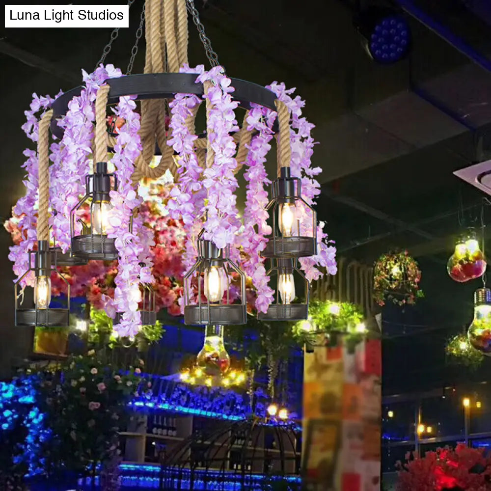 Vintage Hemp Rope Flower Chandelier with Metal Cage and 8 Heads