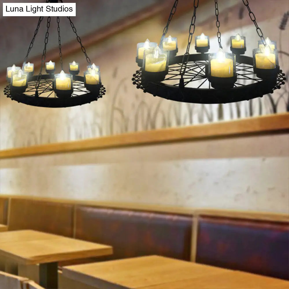 Vintage Candle Ceiling Light Fixture: Black Iron Chandelier with Cylinder Shade & Wheel Design - Ideal for Restaurant Lighting (8-Light)