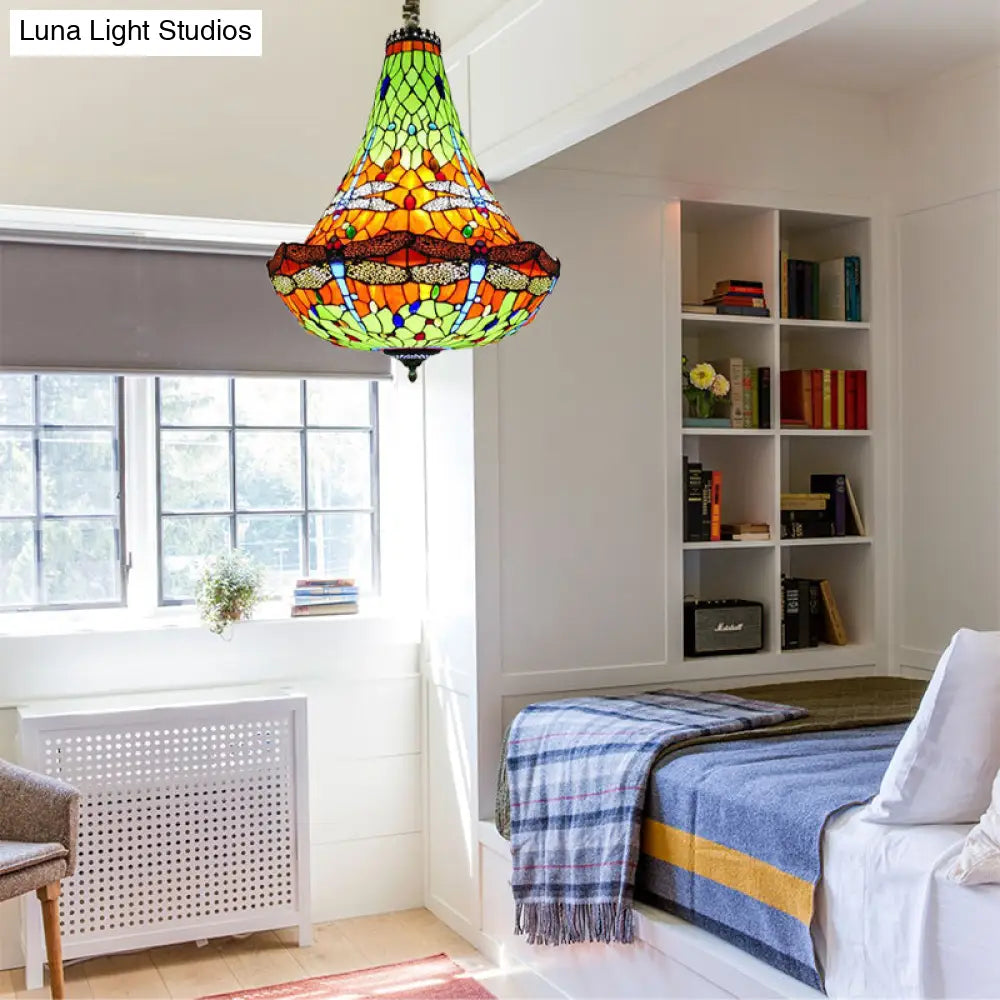 Tiffany Dragonfly Chandelier Light - 16"/19.5" Wide - Stained Glass - 5 Lights - Blue/Green Pendant Lighting for Dining Room