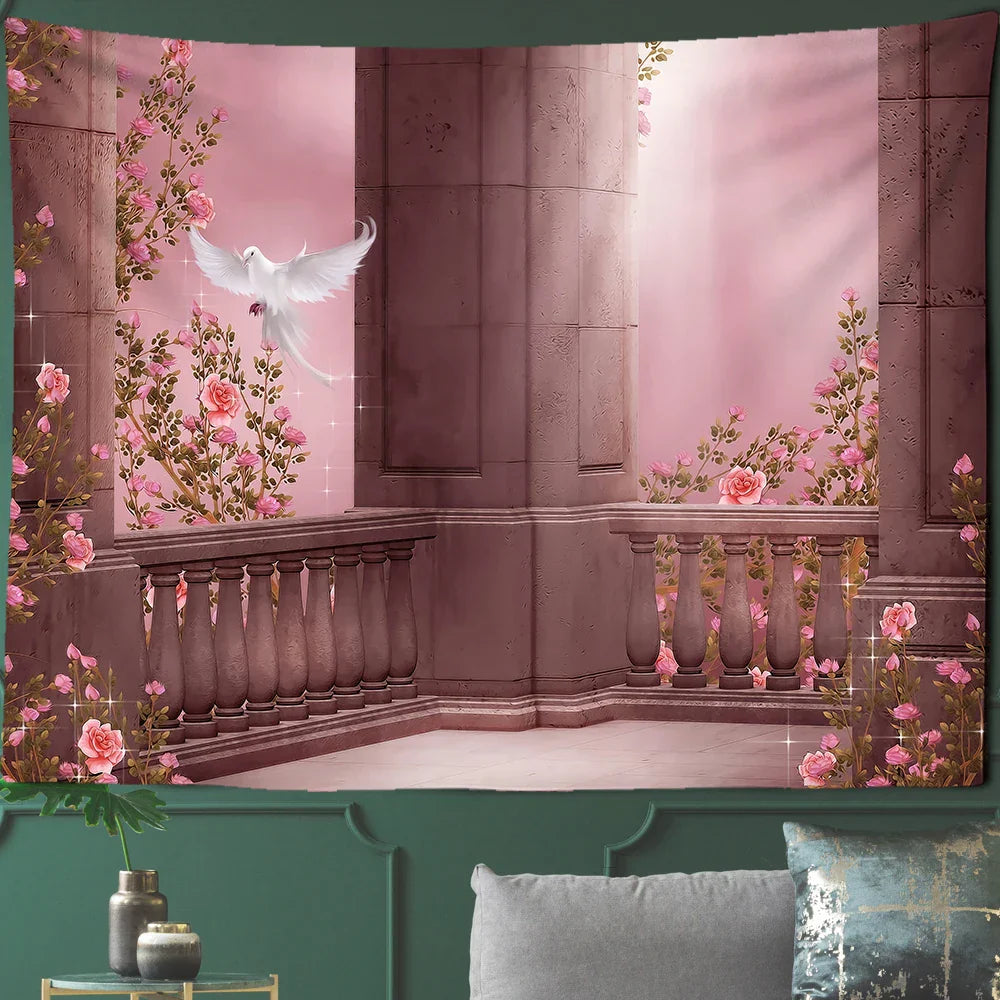 DecorBites™ Court Woman Gothic Architecture Tapestry Wall Art with Rose Scenery & Pigeons