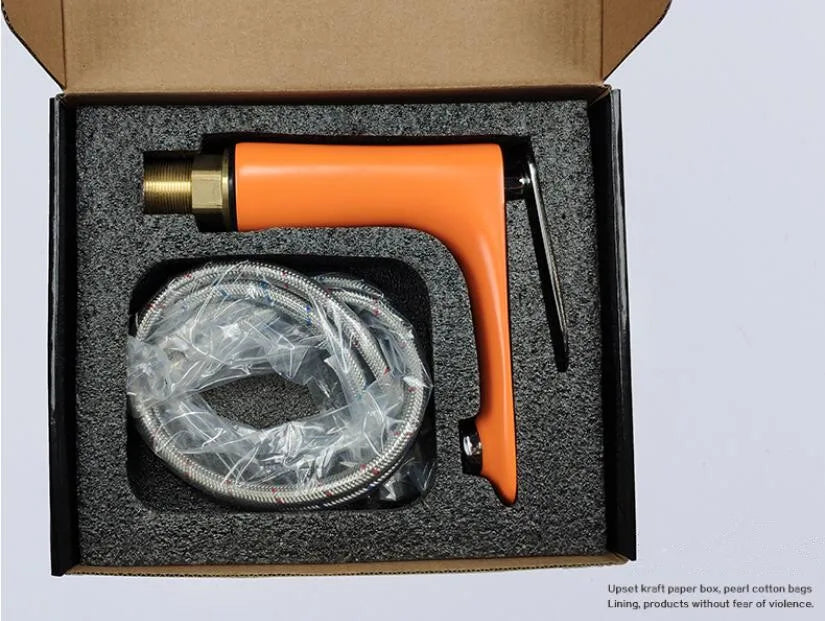 Embrace contemporary elegance with our Basin Faucet, available in a variety of stunning finishes including red, black, orange, and chrome. The sleek and stylish design is enhanced by a single ceramic handle for easy temperature control, making it a convenient and practical choice for any modern bathroom.