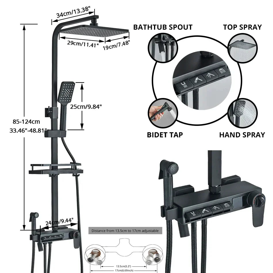 Crafted from high-quality brass with a blackened finish, this shower faucet set exudes elegance and durability. The single handle design and auto-thermostat control make it easy to use, while the ceramic valve core ensures long-lasting performance. The 8-inch shower head, made from A Grade ABS plastic and SUS 304, delivers a luxurious rain shower and waterfall shower experience.