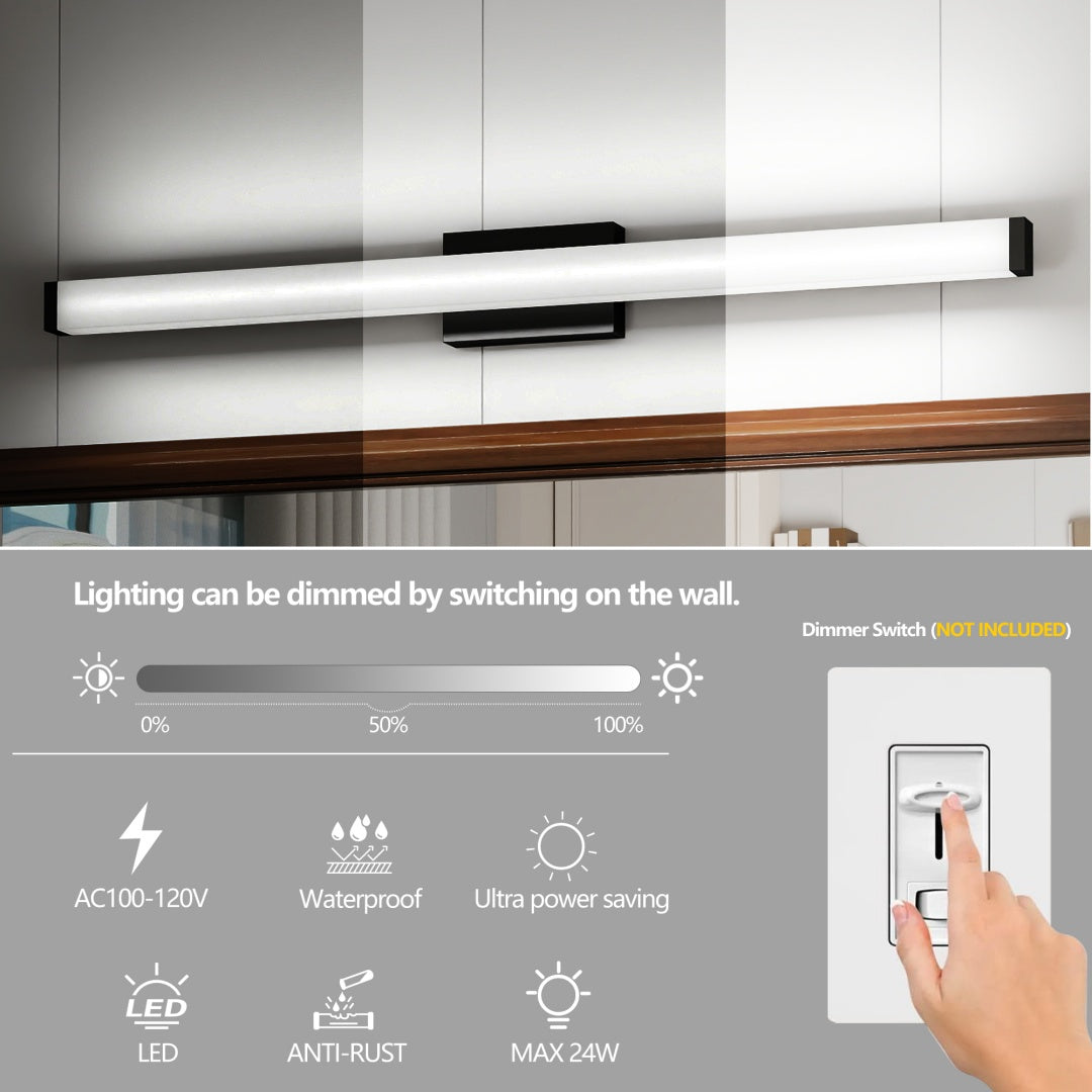 【Energy Saving】 Modern bathroom light fixtures offer energy efficiency at its best.The 24 Watt bathroom wall light fixture can achieve the same brightness as a 90W halogen bulb, and can reduce heat output and save over 90% on the electricity bill of lighting. 【High Quality】 This light fixture bathroom adds an extremely modern vibe with matte balck metal hardware and solid white acrylic shade. Both ends of the light fixture are sealed against moisture to prevent water vapor and mosquitoes from entering. Safe to use and easy to clean. 【Easy & Quick Installation】 This small vanity bathroom light is pre-assembled, only need to mount onto the junction box on the wall. It can be installed horizontally above mirror or vertically on both sides of mirror.