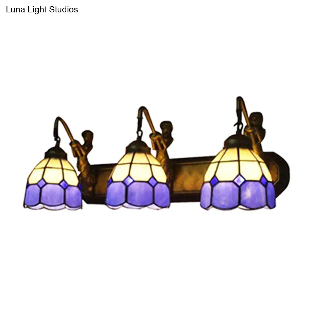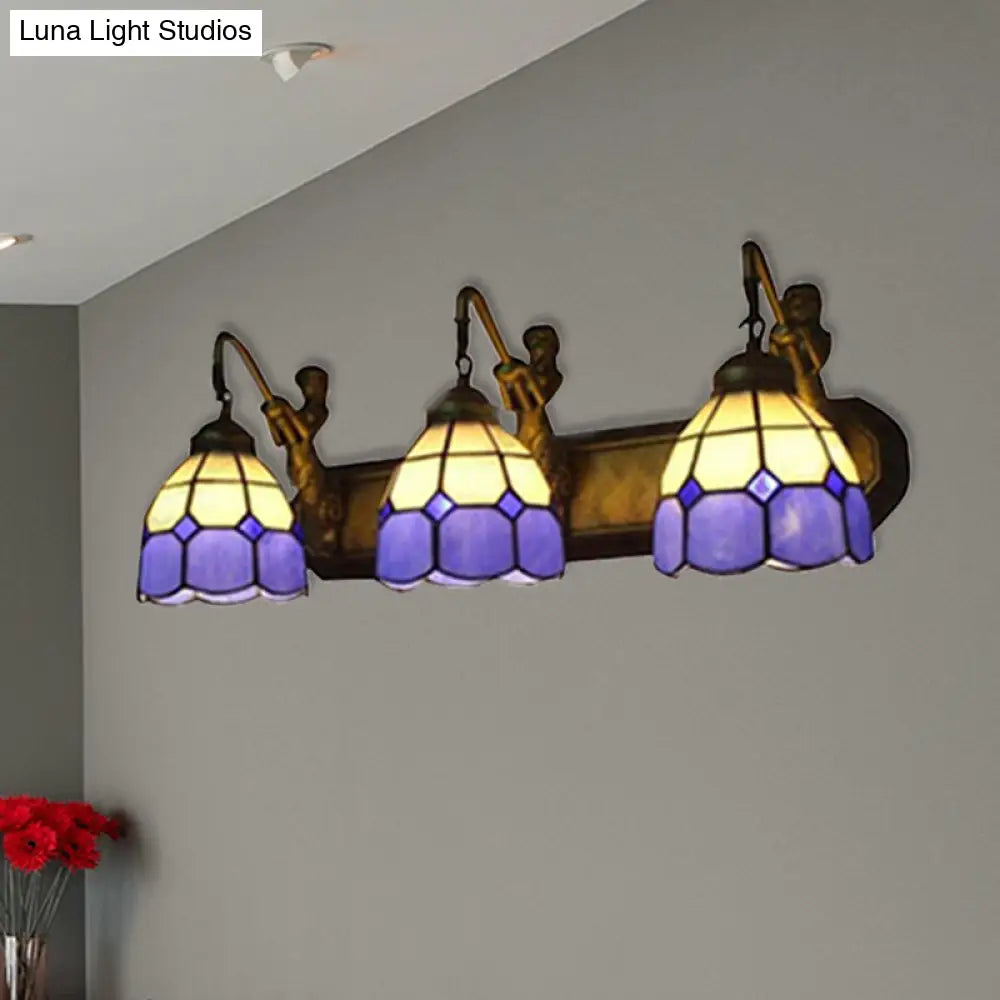 Blue Glass Grid Patterned Sconce Light - Tiffany 3 Head Antique Brass Wall Mounted Fixture