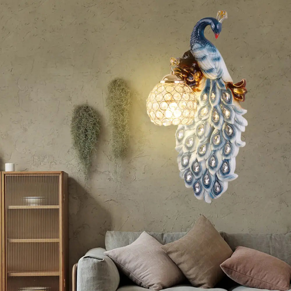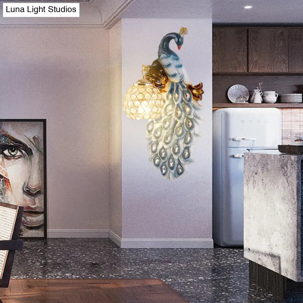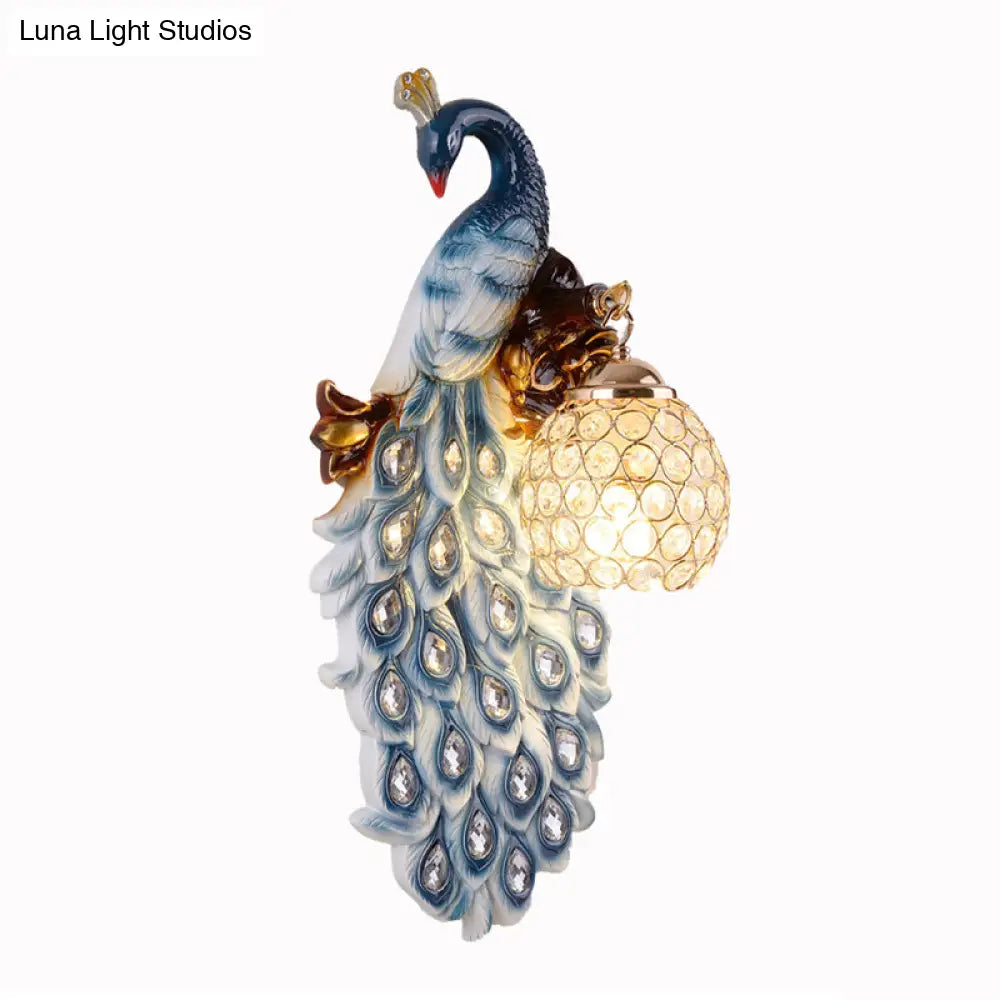 Country Resin Wall Sconce with Blue Peacock Design and Crystal Shade for Dining Room Lighting