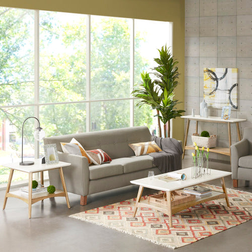 Add the bold Madison Park Parker Coffee Table to your living space. This all wooden mid-century inspired coffee table will go nicely with your living room decor. It features a Off-white finish table top composed from manufactured wood, a solid wood frame, and a bottom shelf for extra storage space. The two-tone gives this table a striking contrast. Assembly required.
