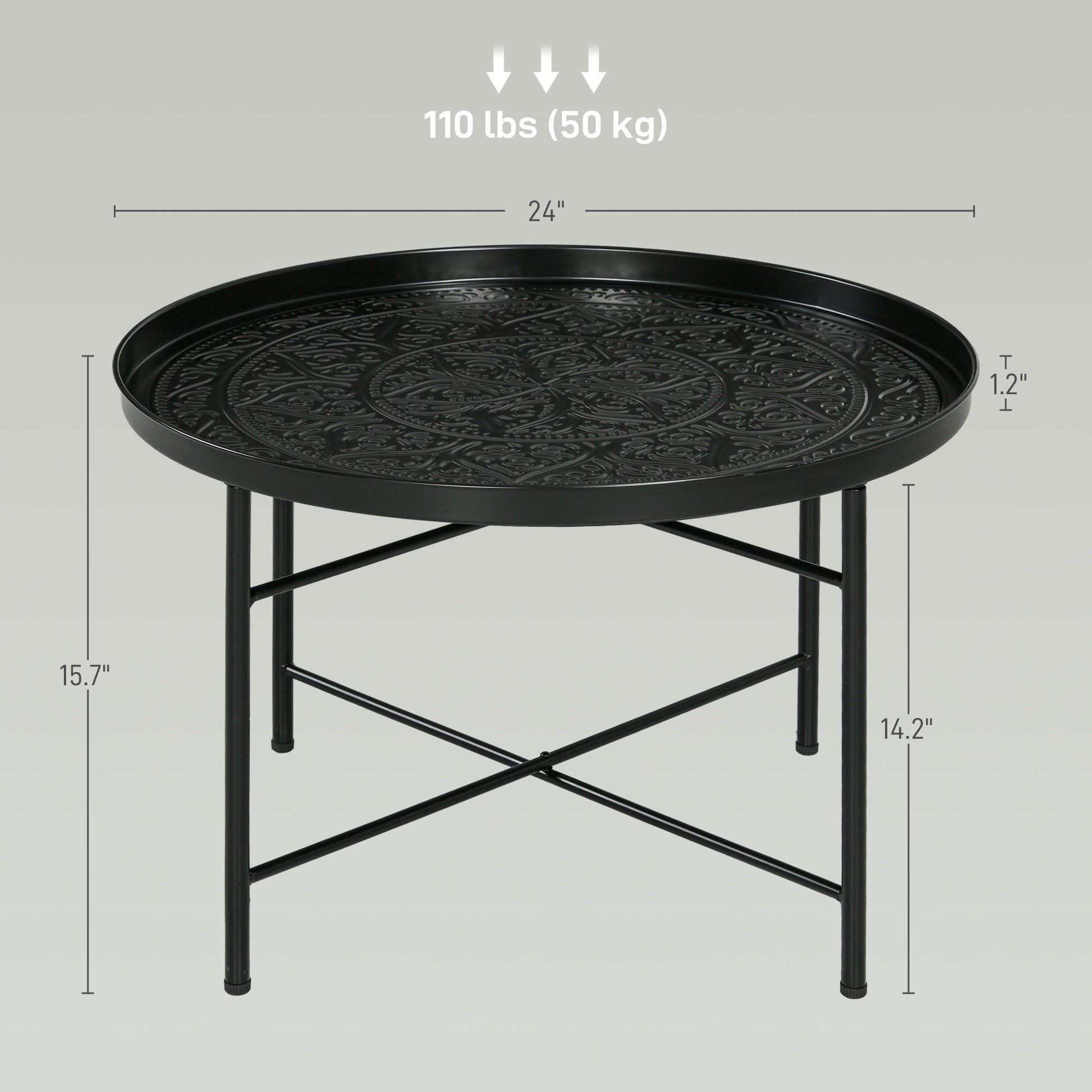 Enjoy the charm of HOMCOM's rustic coffee table. Its handmade brushed metallic finish and hammered floral pattern instantly elevate your living room. This round coffee table, doubling as a center table or a quaint tea table, features a painted metal frame with reinforced crossbars. Adjustable foot pads ensure that our end or side table stays stable on less-than-level locations. Make your house a home with HOMCOM. Features: - Handmade brushed finish adds a unique, elegant touch - Hammered floral pattern - Painted metal frame with crossbars ensures strength - Adjustable foot pads provide stability on uneven floors - Suitable for various settings like living rooms and bedrooms - Assembly required Specification: - Color: Black - Material: Metal - Overall Dimensions: Dia. 24”. x 15.7" H - Tray Size: Dia. 24" x 1.2" H - Feet Height: 14.2" H - Overall Weight Capacity: 110 lbs. - Item Label: 839-975V00BK Package Includes: - 1 x Coffee Table - 1 x Manual Enjoy the charm of HOMCOM's rustic coffee table. Features: - Handmade brushed finish adds a unique, elegant touch - Hammered floral pattern - Painted metal frame with crossbars ensures strength - Adjustable foot pads provide stability on uneven floors - Suitable for various settings like living rooms and bedrooms - Assembly required Specification: - Color: Gold - Material: Metal - Overall Dimensions: Dia. - Item Label: 839-975V00GD Package Includes: - 1 x Coffee Table - 1 x Manual Enjoy the charm of HOMCOM's rustic coffee table. Features: - Handmade brushed finish adds a unique, elegant touch - Hammered floral pattern - Painted metal frame with crossbars ensures strength - Adjustable foot pads provide stability on uneven floors - Suitable for various settings like living rooms and bedrooms - Assembly required Specification: - Color: Pewter - Material: Metal - Overall Dimensions: Dia. - Item Label: 839-975V00GY Package Includes: - 1 x Coffee Table - 1 x Manual.