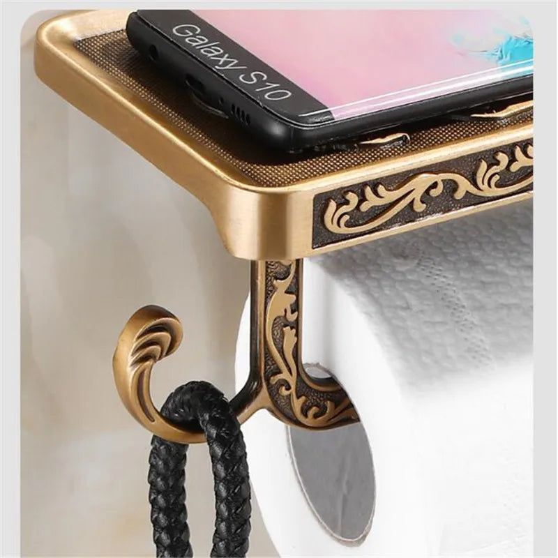 Introducing the Decorbites Antique Black Toilet Paper Holder with Phone Shelf, a perfect combination of style and functionality for your bathroom. Crafted from high-quality Aluminum Alloy, this toilet paper holder is designed to add a touch of elegance to your space while providing a convenient shelf for your phone.