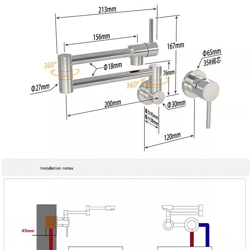 Designed for convenience, this pot filler tap is both functional and stylish. The single handle operation allows for easy control of the cold and hot water flow, while the ceramic valve core ensures durability and reliability. The foldable design adds a practical touch, saving space when not in use.