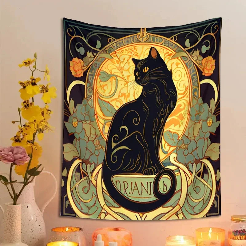 DecorBites™ Black Cat Tapestry Wall Hanging - Psychedelic Floral Art for Cat Lovers