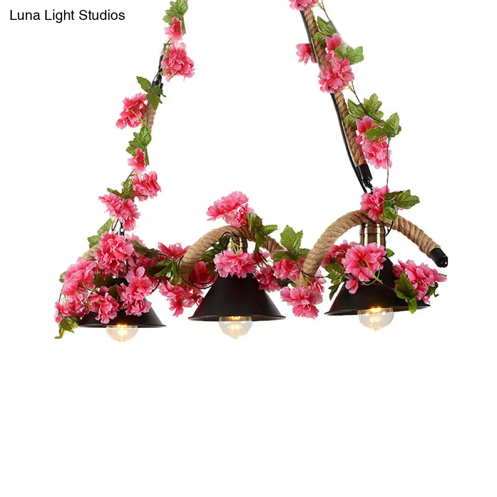 DecorBites™ Black Conical Metal Pendant Light with Twisted Rope and Fake Flower - 3-Light Ceiling Fixture for Restaurants and Warehouses