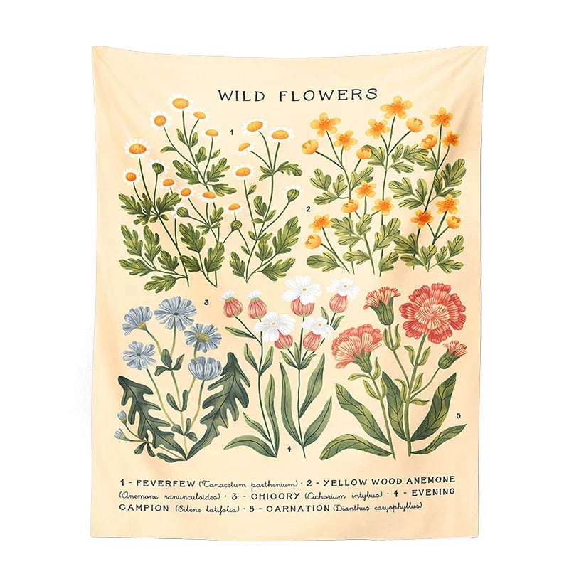 Introducing the Decorbites Botanical Wildflower Reference Chart Tapestry Wall Hanging - a stunning addition to your bohemian home decor collection. Crafted with high-quality materials, this tapestry is designed to bring a touch of nature into your living space.